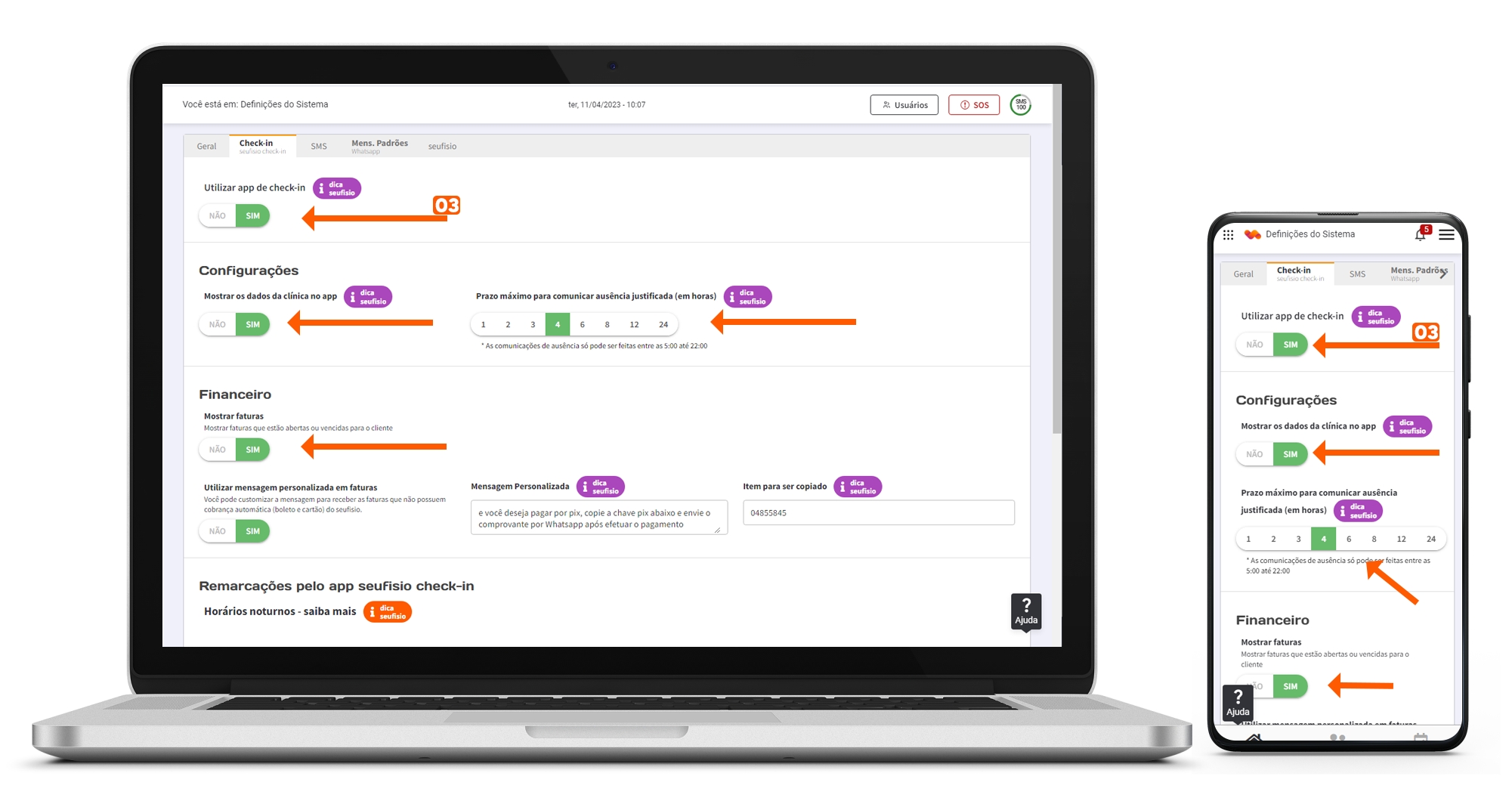 Na tela das configurações, você pode habilitar/desabilitar o uso do aplicativo para toda a sua clínica/estúdio. Se estiver habilitado e você desejar que todos os clientes sejam desconectados do aplicativo de check-in basta selecionar a opção NÃO e salvar. Aqui também você pode marcar se deseja mostrar todos os dados da sua clínica no aplicativo, o prazo máximo que seus clientes podem comunicar uma ausência justificada e customizar mensagens personalizadas em faturas.