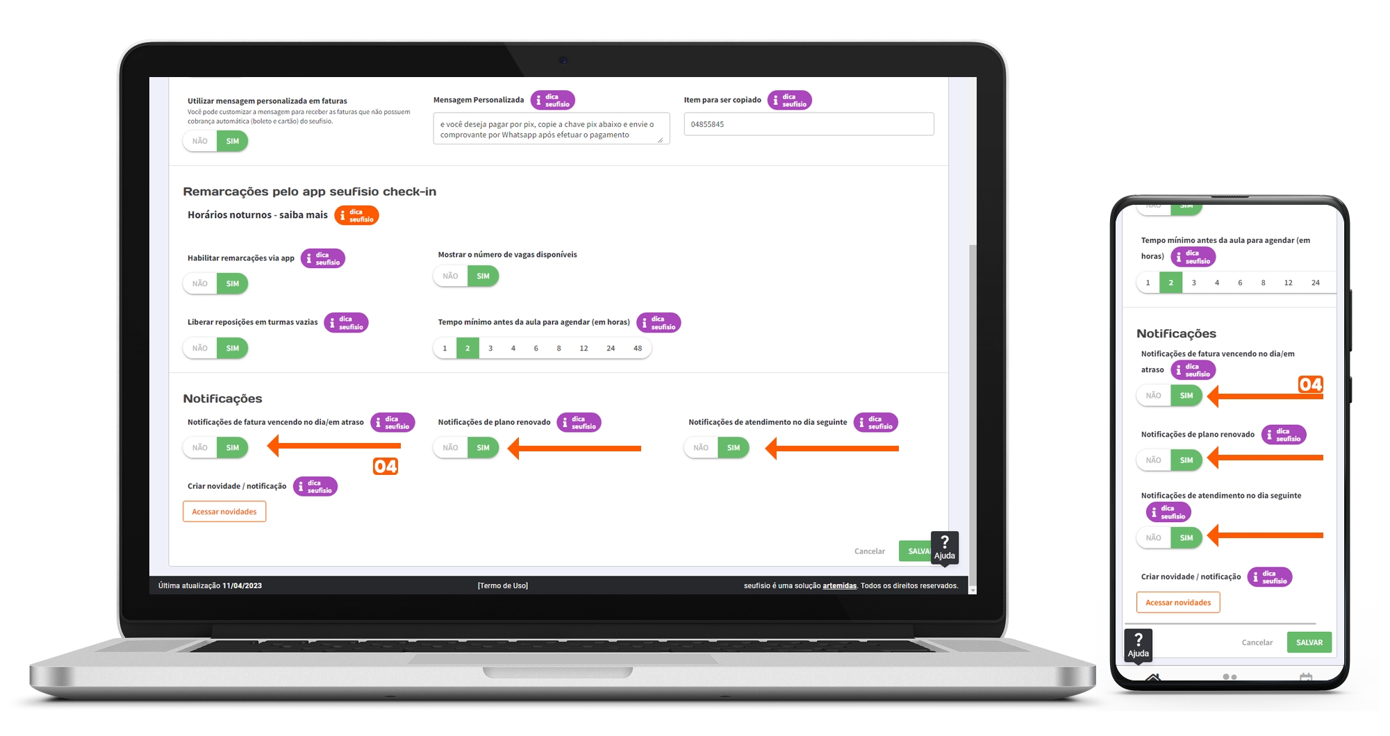 Com o aplicativo seufisio check-in pode-se enviar notificações para o seu cliente, como por exemplo de 'fatura vencendo', de 'plano renovado' ou de 'atendimento no dia seguinte'.