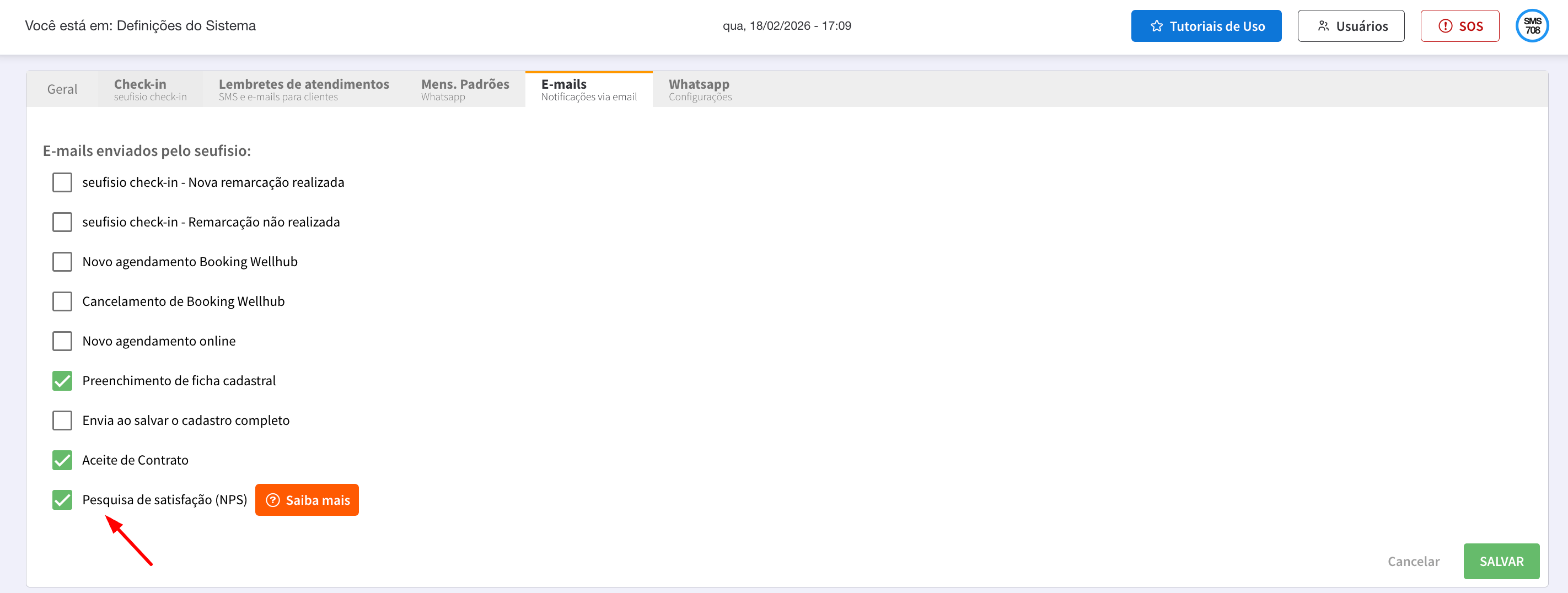 3. Na mesma tela, no menu **E-MAILS** Ative a opção **Pesquisa de satisfação (NPS).**