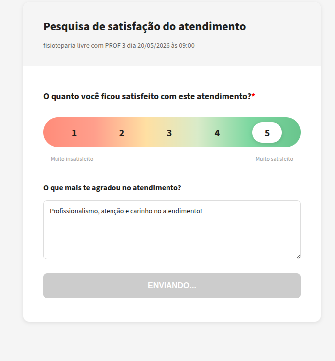 A pesquisa fica associada ao cliente, clínica e ao contexto(atendimento avulso ou pacote/serviço), permitindo relatórios e filtros posteriores.